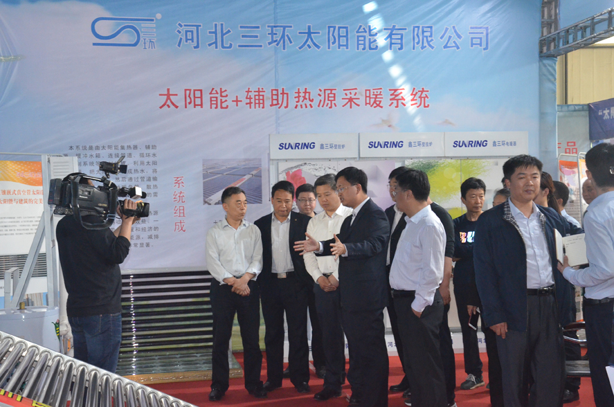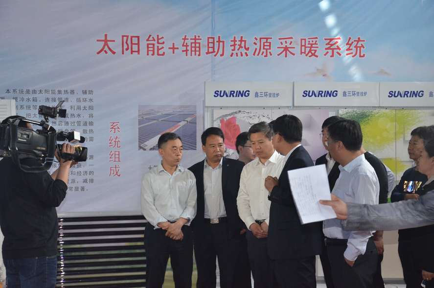 邢臺市市長董曉宇蒞臨我公司展位,我公司總經(jīng)理張振杰介紹我公司新開發(fā)的太陽能+輔助熱源供暖系統(tǒng)。
